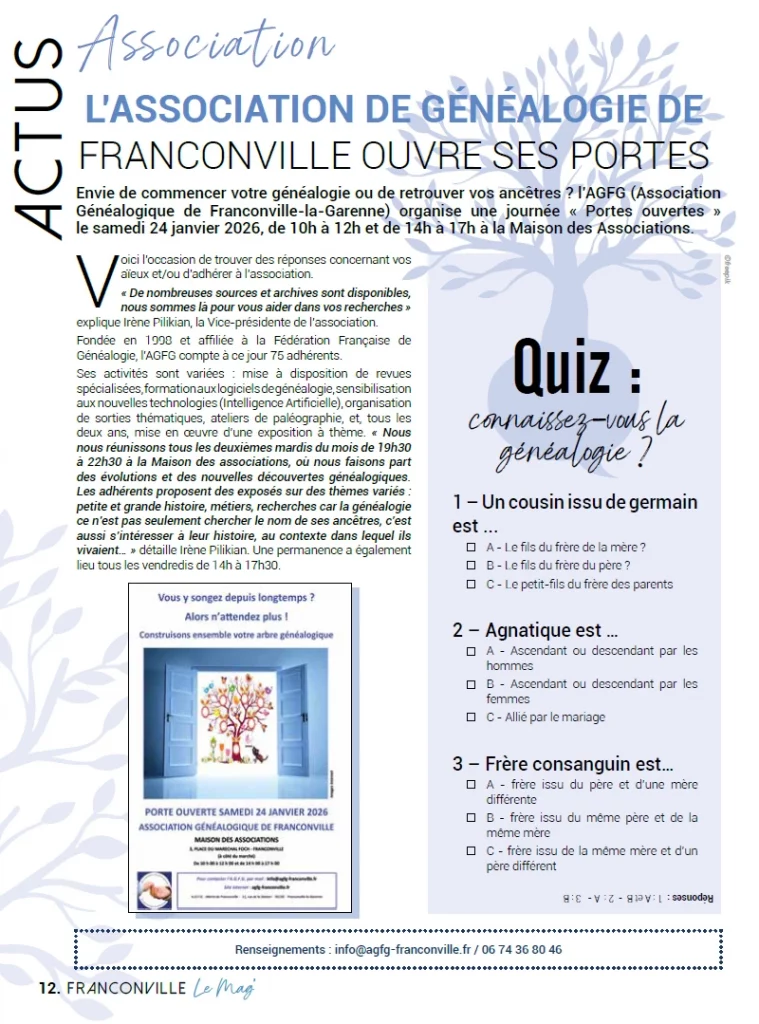 En janvier 2026, le magazine de la ville de Franconville a publié un article sur la journée portes ouvertes organisée par l’Association généalogique de Franconville-la-Garenne (AGFG).